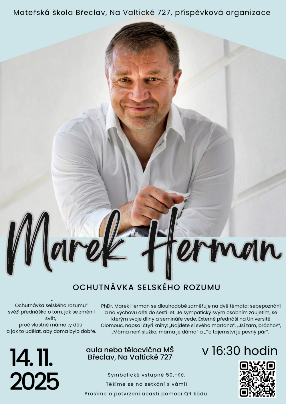 Po oslavě výročí školky přichází další skvělá akce, tentokrát s Markem Hermanem. Myslím, že není třeba ho představovat 😊 Na setkání se prosím registrujte. Uvidíme se v pátek 14. listopadu.